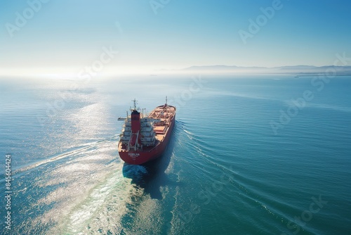 An aerial view of a large cargo ship sailing through the open ocean on a sunny day.