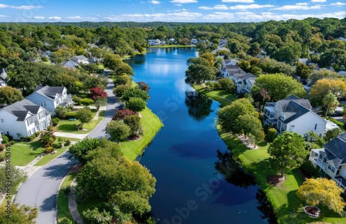 An aerial view of the Florida community with its residential houses and lush greenery, showcasing large lakes in between them.