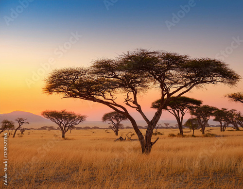 An African acacia tree spreads its branches over golden savanna grass during a colorful sunset.
