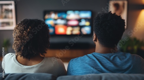 An African American couple relaxes together on the couch at home, watching TV and enjoying each other's company during their free time