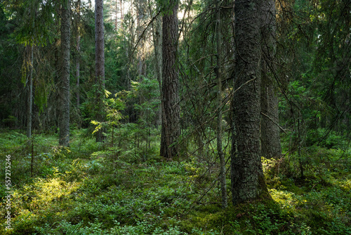 An aged coniferous forest on a late summer evening in Northern Latvia, Europe