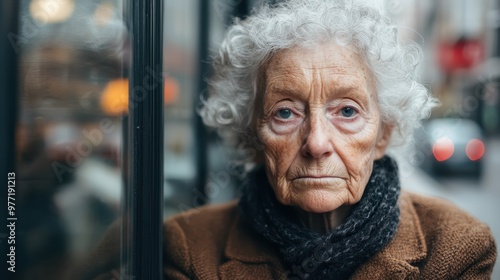 An aged woman with a solemn gaze looks out a window, embodying wisdom and contemplation, dressed warmly in a brown coat and a colorful knit scarf.