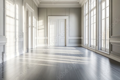 An airy room with ash grey wood floors and pristine white doors, highlighted by sunlight from panoramic windows