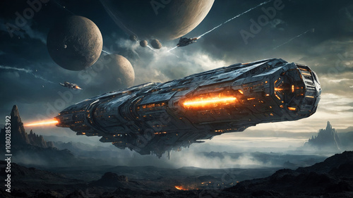 planet, take-off, taking off, alien, heavy, ship, vessel, science fiction, science fiction, technology, advanced, advanced technology, cosmic, cosmos, universe, space, deep space, outer space, exploration, space-travel, render, surface, metallic, texture, design, graphic, three-dimensional, three-dimensional, effect, motion, flight, fly, atmosphere, fantasy, imagination, vision, visual, creative, concept, conceptual, composition, background, illustration