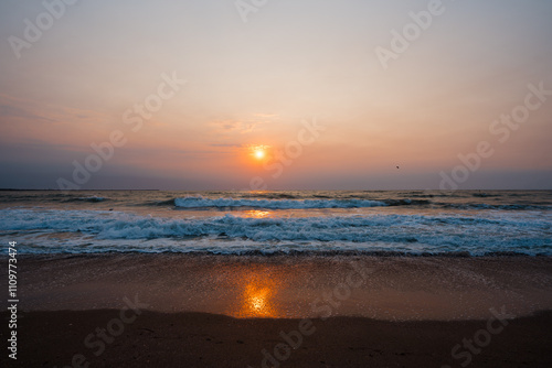 An amazing sunrise over the Black Sea in Eforie, Romania, offers a breathtaking sight as the sun begins to rise over the horizon.