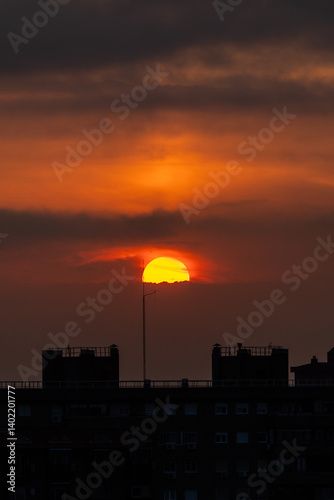 An amazing warm sunset over the skyline of Madrid in the Hortaleza neighborhood