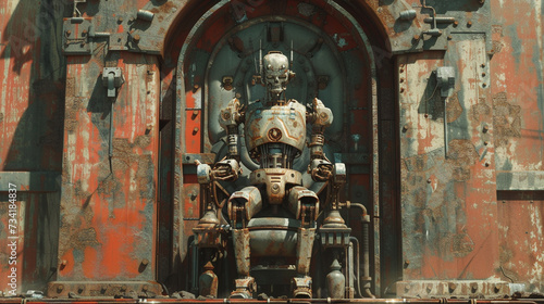 An ancient and wise robotic swordmaster sitting on a throne in a rusting futuristic castle