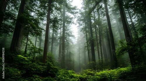 An ancient forest with towering redwoods, mist, and a lush understory.