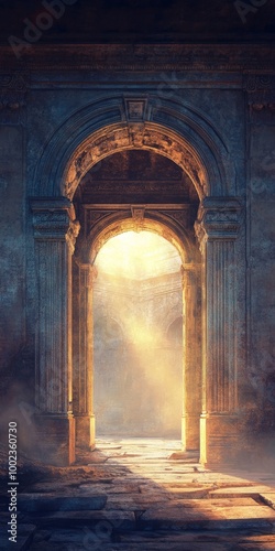 An ancient Roman gate with dark stone light shining