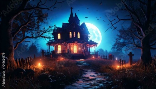 An ancient Russian cathedral standing tall in the woods at night, resembling a haunted castle, surrounded by a dark, mysterious landscape