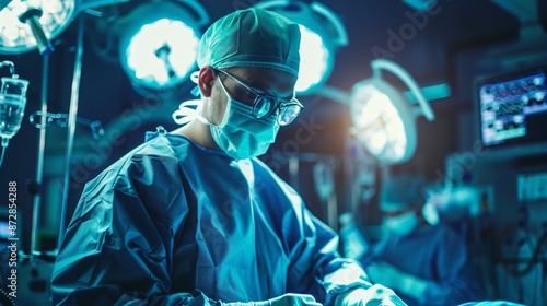An anonymous surgeon in the middle of a complex surgery, only the hands are visible performing precise movements, surrounded by high-tech medical equipment