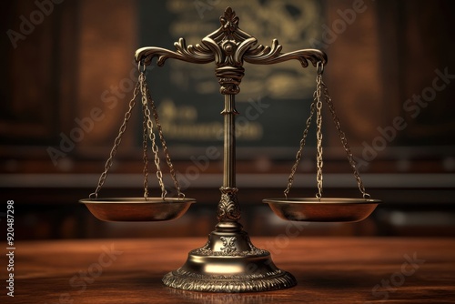 An antique brass balance scale with ornate details, perfectly balanced, set on a polished wooden table