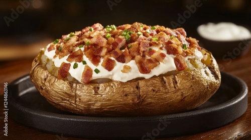 An appealing shot of a loaded baked potato topped with crispy bacon bits, sour cream, and chives, highlighting the deliciousness of this comfort food