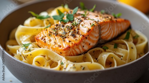 An appetizing bowl of pasta with a perfectly seasoned salmon fillet, topped with herbs