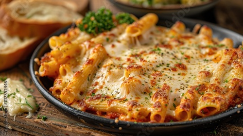 An appetizing plate of baked ziti with a golden cheese crust and a side of garlic bread, presented on a rustic wooden table