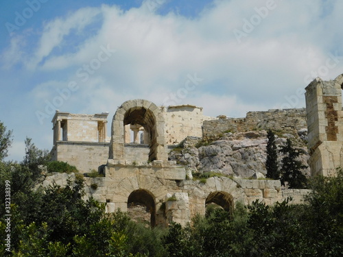 An arch of the Odeon of Herodes Atticus, or Herodeon, and the temple of Athena Nike, on the Acropolis, in Athens, Greece
