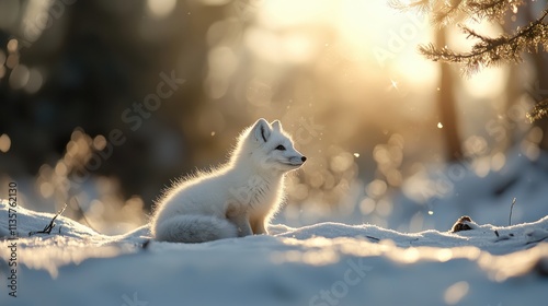 An arctic fox sitting on snow with its fur blending into the background.