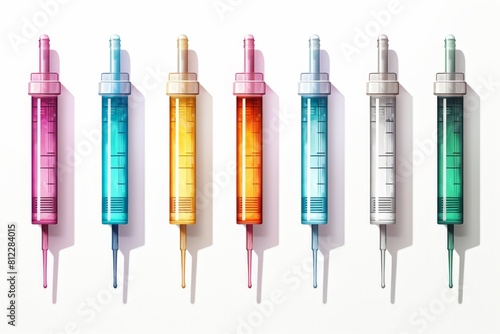 An array of six colorful medical syringes aligned on a white background, showcasing diverse medical applications.