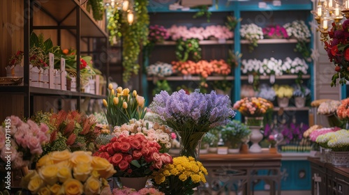flower, interior, shelf, shop, bloom, colourful, floral, florist, beauty, abundance, variety, nature, calmness, serenity, decor, vintage, rose, tulip, lily, daisy, hydrangea, lavandula, peony, bouquet, vase, greenery, arrangement, market, business, retail, commerce, sale, garden, botanical, flower petals, elegant, fragrant, ornamental, wholesale