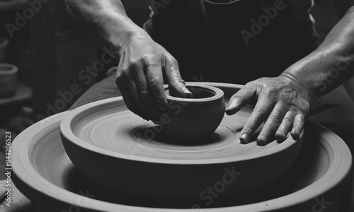 An artisan potter shaping a clay masterpiece on a pottery wheel in a rustic studio, clay splattered and hands skilled