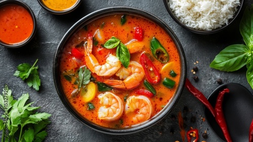 An artistic arrangement of a bowl of tom yum soup with fresh shrimp and colorful vegetables, complemented by a side of jasmine rice and dipping sauces