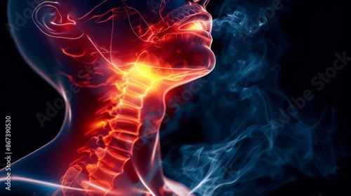 human, head, neck, throat, spine, burning, sensation, pain, discomfort, inflammation, disease, symptom, medicals, anatomy, illustration, smoke