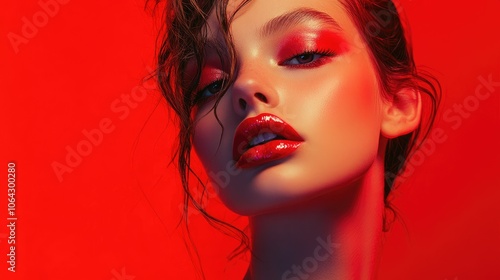 An artistic portrait of a woman adorned with elegant makeup, showcasing bold lips and striking