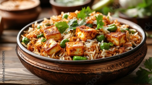 An artistic shot of paneer biryani in a traditional Indian dish, surrounded by fresh ingredients