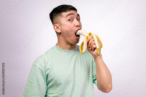 An Asian adult male in a light green t-shirt is eating a peeled banana while looking at the camera. The image has a white background, emphasizing a clean, minimal, and natural theme
