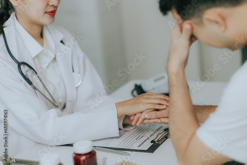 An Asian female doctor gives a pep talk to a male patient inside the hospital.