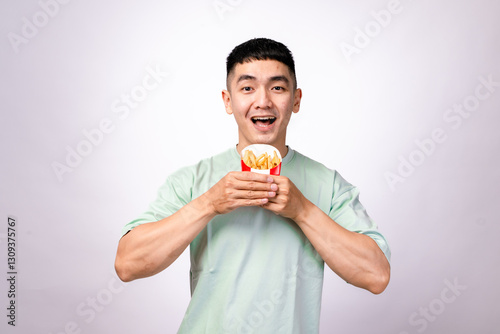 An Asian man wearing a light green shirt holds a red container of French fries with both hands while smiling. He looks excited to eat. The background is white, and the fries appear crispy and golden