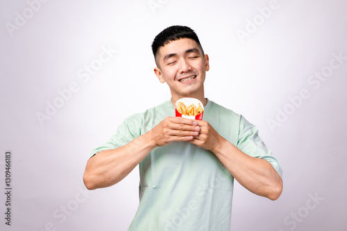 An Asian man wearing a light green shirt holds a red container of French fries with both hands while smiling. He looks excited to eat. The background is white, and the fries appear crispy and golden