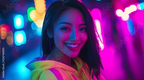 smiling, happy, neon, asian, fashionable, stylish, retro, expressive, pop, nightlife, futuristic, aesthetic, art, colourful, earring, style, future, coiffure, energetic, fashion, 90s, artistic, dynamic, fun, glow, culture, youth, jacket, lighting, cool, bold, positive, modern, creative, light, 80s, vibrant, urban, trendy, electric, accessory, playful, upbeat, hip, unique, eccentric
