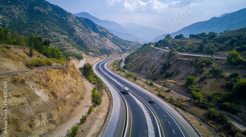 An asphalt road winds through a mountainous landscape, with vehicles of various sizes traversing its surface. A paved highway stretches out for transportation