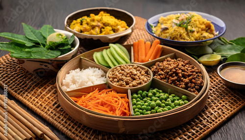 vegetable, rice, food, healthy, dish, plate, table, assortment, meal, ingredient, harvest, carrot, grain, delicious, local, favor, receipe, wholesome, seasonal, organic, culinary, artisan, vegetarian, portion, savour, presentation, sustainable, wooden, side, garnish, accessing, vitamin, tasty, nourishment, cookery, mineral, dietitian, texture, aroma, colours, diet, epicure, onion