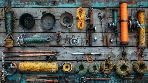 fishing, gear, tackle, dock, wood, rope, line, reel, rod, hook, bait, lure, sinker, bobber, net, knot, bucket, orange, yellow, blue, green, brown, grey, black, wooden, metal, twine, cord, string, plait, braid, hook, handle, spinner, swivel, clip, ring, stopper, lead, weight, float, buoy