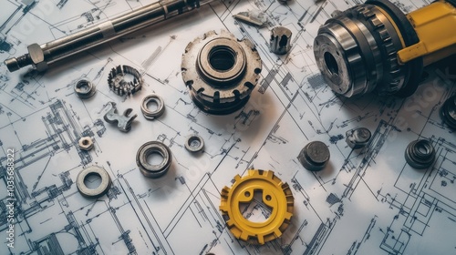 An assortment of mechanical parts laid on top of technical blueprints, focusing on detailed engineering and mechanical design
