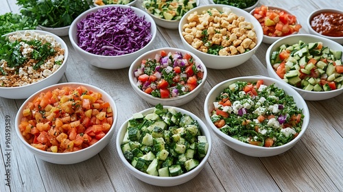assortment, refreshing, salad, including, greek, coleslaw, laid, light, grey, wooden, floor, vibrant, colours, texture, ingredient