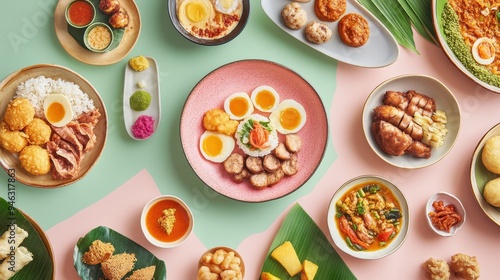An assortment of traditional Indonesian dishes beautifully arranged, highlighting vibrant colors and diverse flavors