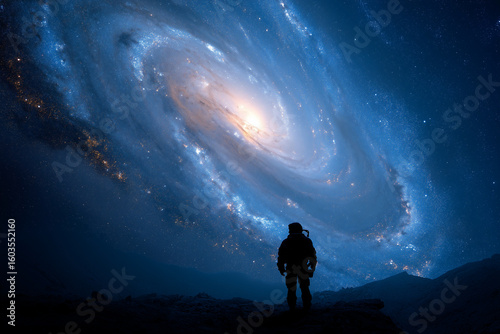 An astronaut's silhouette against the backdrop of a colossal, spiraling galaxy, emphasizing human exploration and the vastness of space