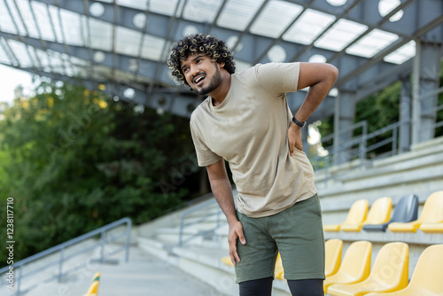 person, sport, athlete, pain, cramp, backache, injured, back, people, touching, exercising, problem, recovery, ache, man, male, hispanic, latino, indian, inflammation, muscle, arthritis, copy space, uncomfortable, sprain, jogging, well-being, stretching, fitness, ethnicity, effort, disease, routine, sleepy, muscular, neck, physical, runner, spine, training, standing, massaging, risk, sorrowful, stadium, marathon, chronic, ill, rheumatism, physical exercise