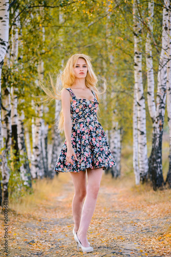 An attractive girl with long hair in a short dress walks in the Park.