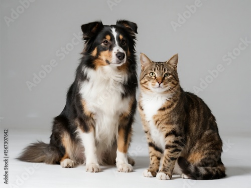 an Australian Shepherd and a tabby cat sitting side by side, full-body shot, neutral background, studio lighting