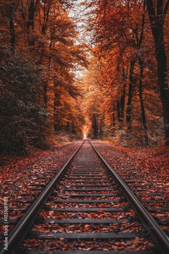 An autumn forest with trees in orange and red leaves, with the ground covered by fallen leaves. The railway tracks go straight through it.