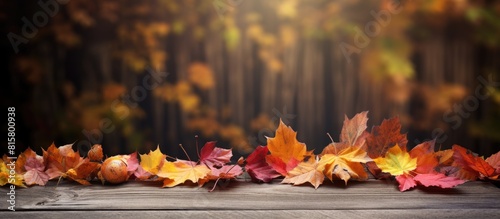 An autumnal scene unfolds on an old weathered wooden table with vibrant leaves framing the copy space image