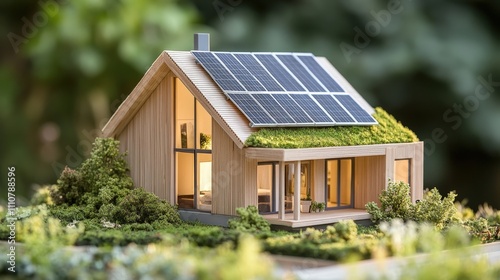 An eco-friendly house model with green roofing, solar panels, and sustainable materials, blending modern design with environmental awareness