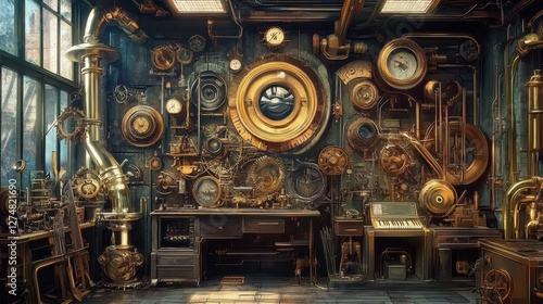workshop, gear, cog, brass, dial, gauge, pipe, machinery, intricate, mechanism, instrument, clock, lever, tube, room, interior, workbench, laboratory, retro, vintage, design, industrial, old, antique, metal, copper, engineering, contraption, device, equipment, texture, window, light, shadow, pattern, complex, detailed, wall, keyboard, piano, surreal, fantasy, art, illustration, drawing, creative