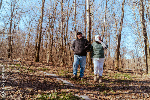 An elderly couple, a man and a woman, walk through a spring forest, enjoying the beauty of nature. Sunlight filters through fresh green leaves, creating a serene and romantic atmosphere