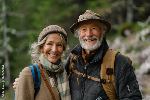 An elderly couple joyfully embarks on a scenic hiking adventure, embracing benefits of fitness walking and immersing themselves in beauty of nature, exemplifying vitality and enthusiasm of active seni