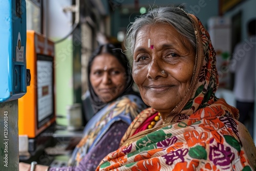 An elderly Indian woman, adorned in a vibrant headscarf, smiles gently beside a younger woman, near a payment kiosk.